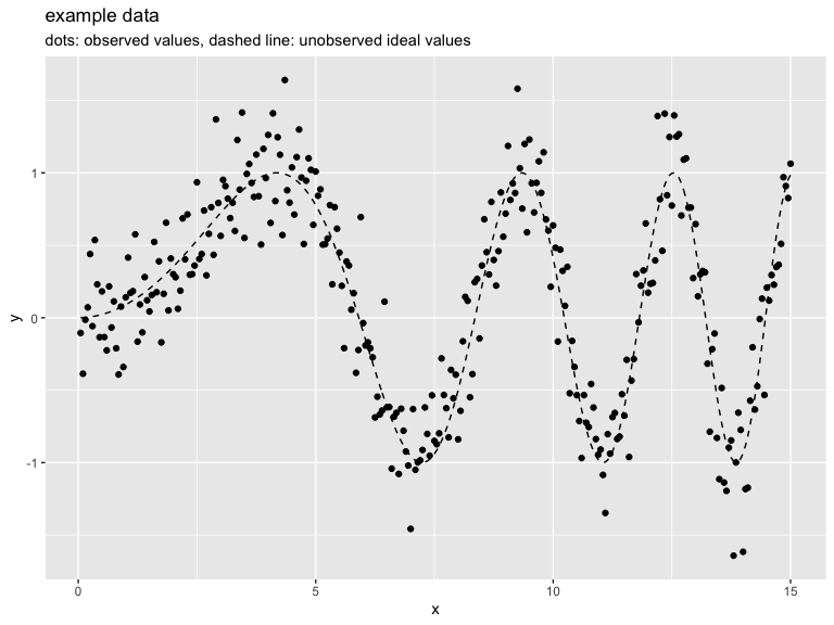 In the above we have an input (or independent variable) x and an observed outcome (or dependent variable) y_observed (portrayed as points). y_observed is the unobserved idea value y_ideal (portrayed by the dashed curve) plus independent noise. The modeling goal is to get close the y_ideal curve using the y_observed observations. Obviously this can be done with a smoothing spline, but let’s use RcppDynProg to find a piecewise linear fit.