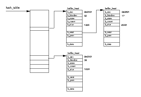 キャッシュ内のブロックバッファは、それを保持するデバイスの識別子とバッファ のブロック番号とによってユニークに識別される。バッファキャッシュはふたつの 機能別部分から構成される。最初の部分は、空のブロックバッファのリストである。 サポートされるバッファサイズごとにひとつのリストがあり、システム上の空のブロッ クバッファは、初めて作成されたり、削除されたときに、それらのリスト上の待ち行列 に置かれる。現在サポートされているバッファサイズは、512, 1024, 2048, 4096, そして 8192 バイトである。第二の部分は、キャッシュそのものである。これは ハッシュテーブルであり、そのハッシュテーブルは同じハッシュインデックスを持つ バッファに対するポインタの配列である。ハッシュのインデックスは、該当 ブロックを保持するデバイスの識別子とデータブロックのブロック番号から生成され る。 図表(9.7)では、ハッシュテーブルがいくつかの エントリとともに示されている。 ブロックバッファはフリーリストのいずれかひとつにあるか、バッファキャッシュの 中に存在する。バッファキャッシュにあるときは、それらは最長時間未使用(LRU) リスト上のキューにも置かれる。LRU リストは個々のタイプのバッファごとに存在し、 システムがそのタイプのバッファ上で処理をする際、たとえば、バッファ内の新しい データをディスクに書き出す際などに使用される。バッファタイプとはその状態 (state)を反映するものであり、Linux では現在次のようなタイプがサポートされて いる。
