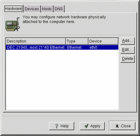 From the main Red Hat Network Administration Tool window, use the Hardware tab to add, edit, or delete Ethernet, modem, ISDN, and token ring hardware configurations.