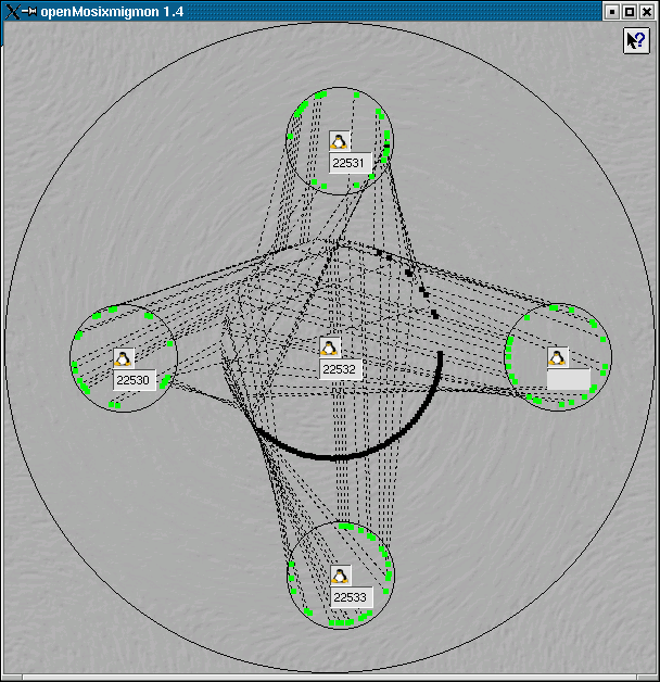 The main penguin is the node on which openMosixmigmon runs and around this node it shows its processes also in a circle of small black squares.