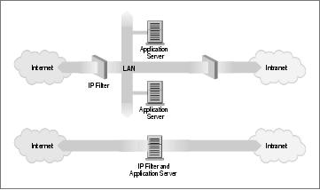 Typically though, firewalls are single machines that serve all of these functions. These are a little less secure, because if there is some weakness in the firewall machine itself that allows people to gain access to it, the whole network security has been breached. Nevertheless, these types of firewalls are cheaper and easier to manage than the more sophisticated arrangement just described. Figure 9-1 illustrates the two most common firewall configurations.