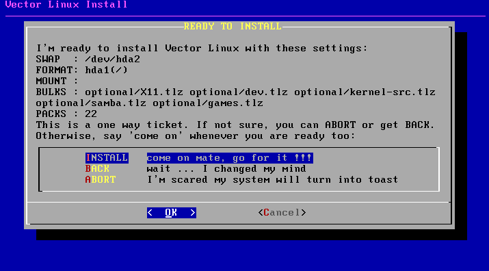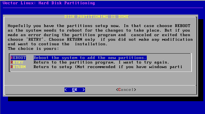 The installation halts somewhere near the end during the install of packages and the install process gives you an error message that it cannot proceed. This often indicates that you may not have apportioned sufficient hard drive space for the "/" (root) partition. VectorLinux requires a minimum of 2GB to install, 3GB for the SOHO edition. You will need to increase the size of the root partition before proceeding to re-install the system. This can be done using cfdisk during the second install screen.